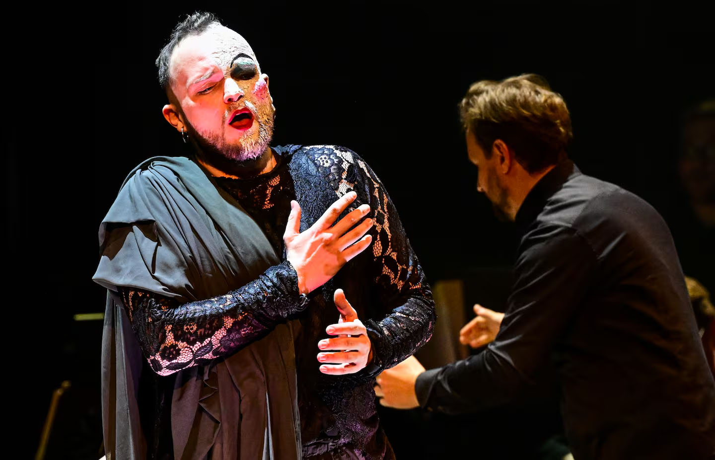 C’est après que Wanderer arrive, grimé comme un fantôme de l’Opéra androgyne, pour When I am laid de Didon et Énée de Purcell et Stille amare de Tolomeo de Haendel. La voix du contreténor n’est pas encore bien réchauffée dans le premier morceau, mais on est tout de suite happé par sa présence, le genre de présence qui interdit de diriger ailleurs le regard. Par son incarnation totale du texte et sa gestuelle théâtrale joliment surannée, le chanteur allemand, qui fera ce printemps ses débuts au Metropolitan Opera, nous gagne immédiatement à sa cause.